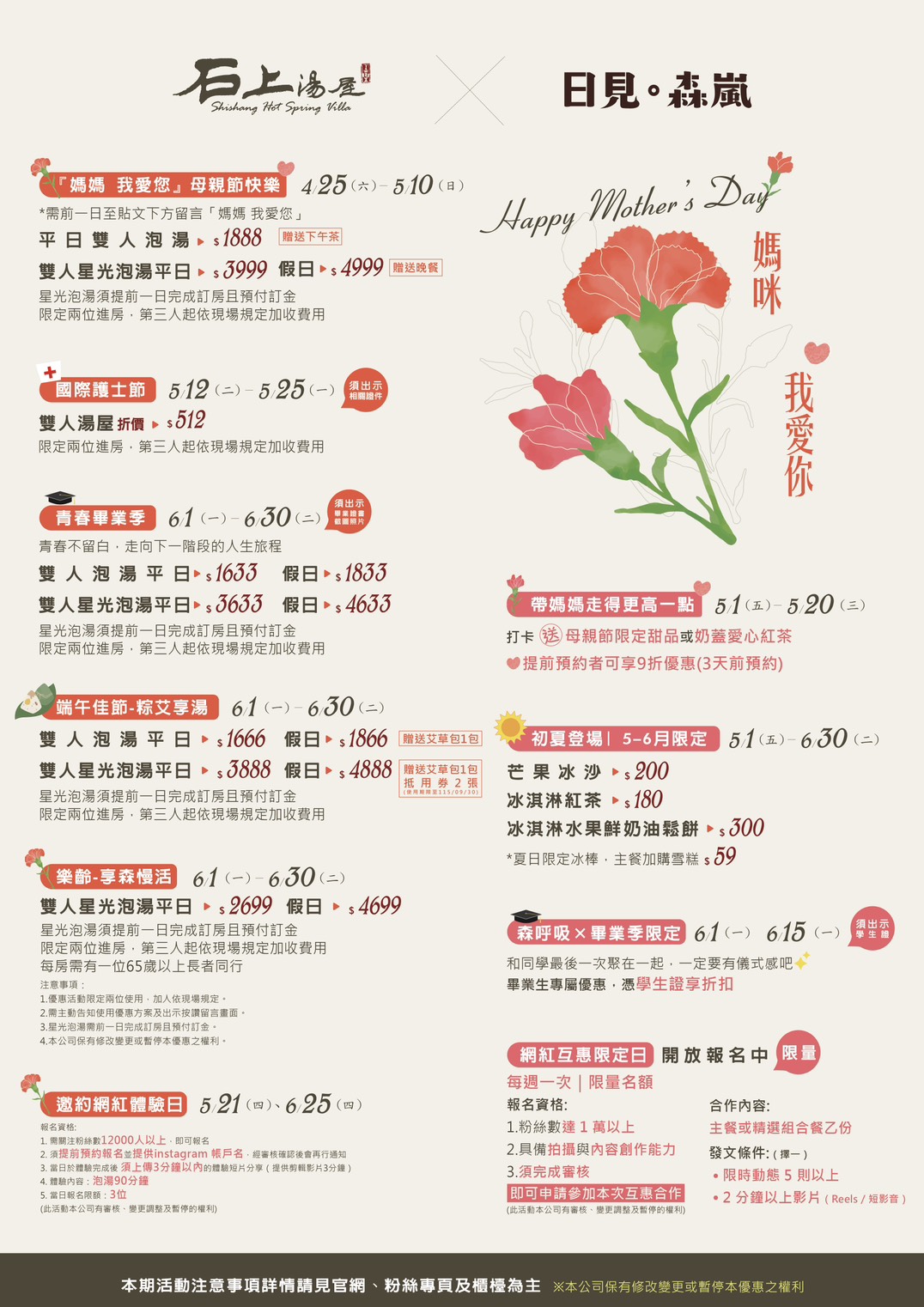 3.星光泡湯需前一日完成訂房且預付訂金。